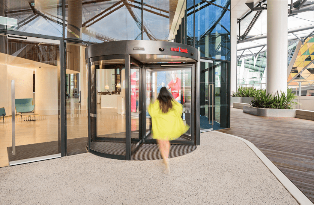Revolving doors typically consist of three or four panels fixed to a central axis that rotates within a cylindrical enclosure. To enter a building, a person simply steps into the space between two panels and moves toward their desired exit, following the door’s rotation.